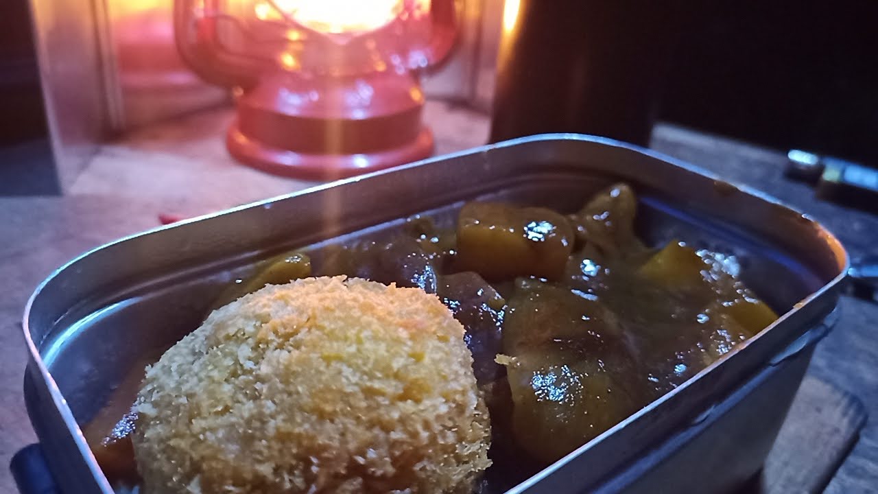 メスティン炊飯とレトルトカレーです。 家に近所の肉屋さんのコロッケがあったので追加。