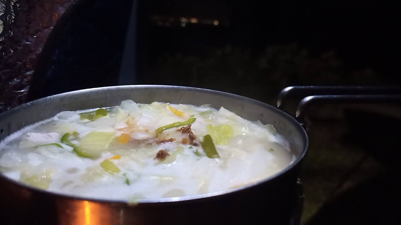豚肉、ハクサイ、ジャガイモ、長ネギ、タマネギと余っていた食材でクリームシチューです。