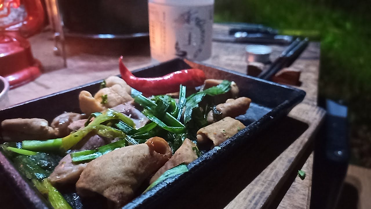 ニラと唐辛子を加えてみました。 安くてウマい! おススメの食材です。