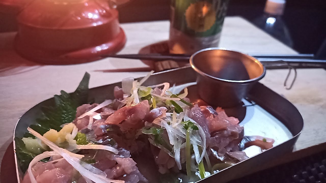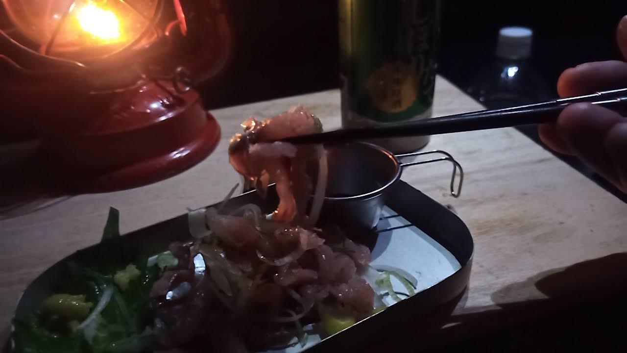 アジのタタキに菊水しぼりたて純米酒でキャンパーイ!