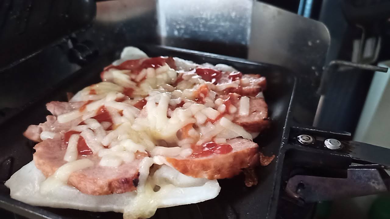 ハムを焼いたら薄切り餅をかぶせて、ホットサンドメーカーをひっくり返す。
