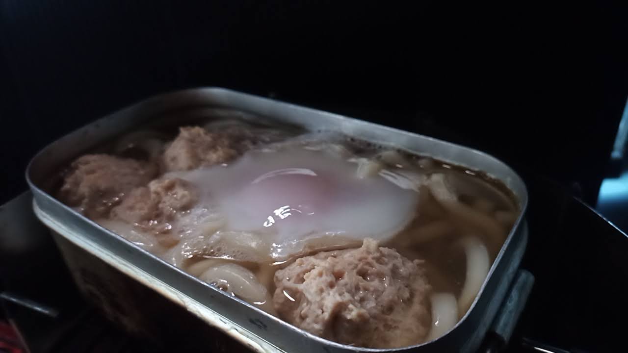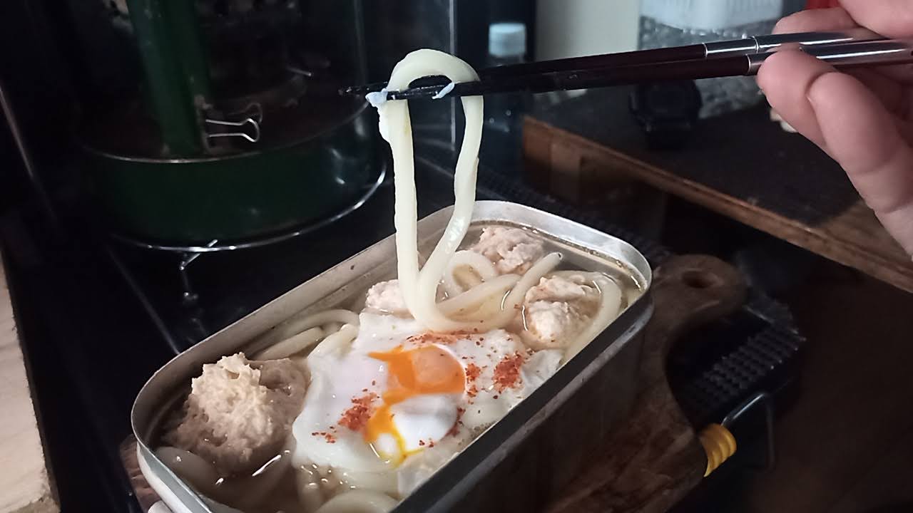 ダイソーメスティン2合で鶏団子うどん。 鶏団子から良い出汁が出ています。