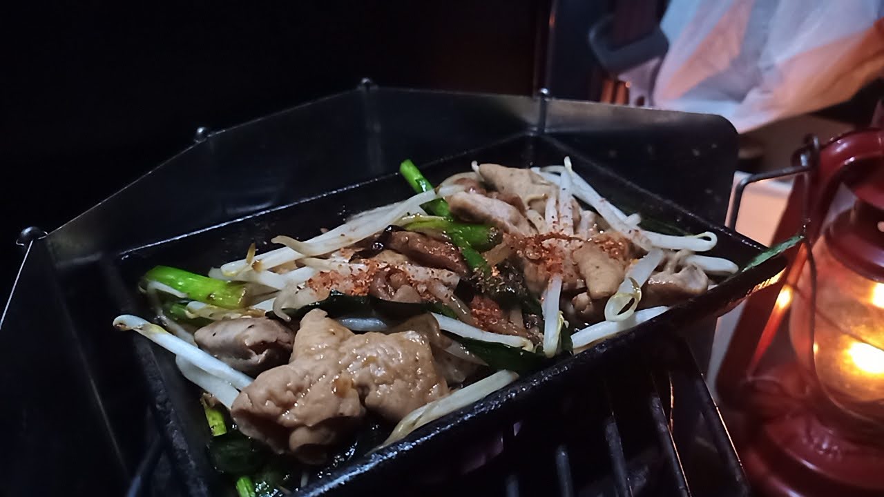 【吹雪キャンプ】金華亭のほるもん鉄板焼きと炊きてご飯でキメてみた!