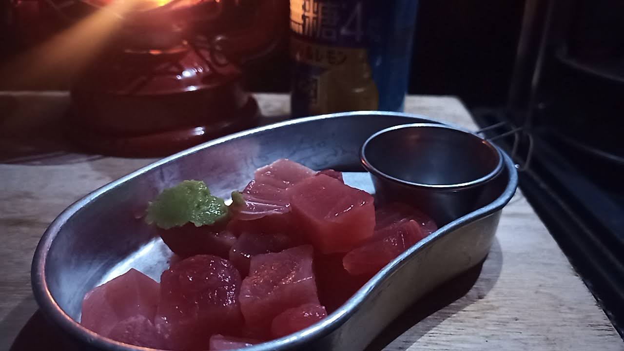 マグロの刺身でキャンパーイ。 薄いスライスよりぶつ切りの方が食感がイイですね。