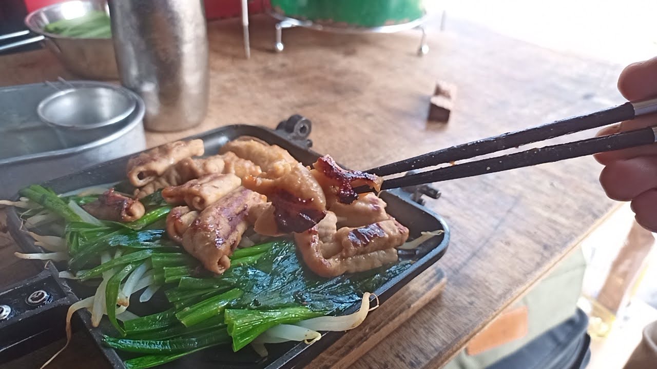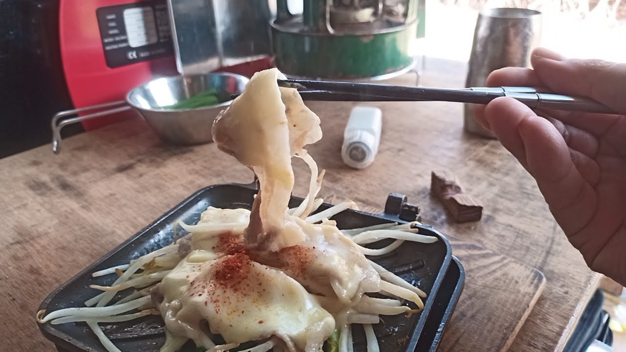 その後、モヤシとニラを並べて、ひっくり返してニラに軽く火が通ったら完成です。
