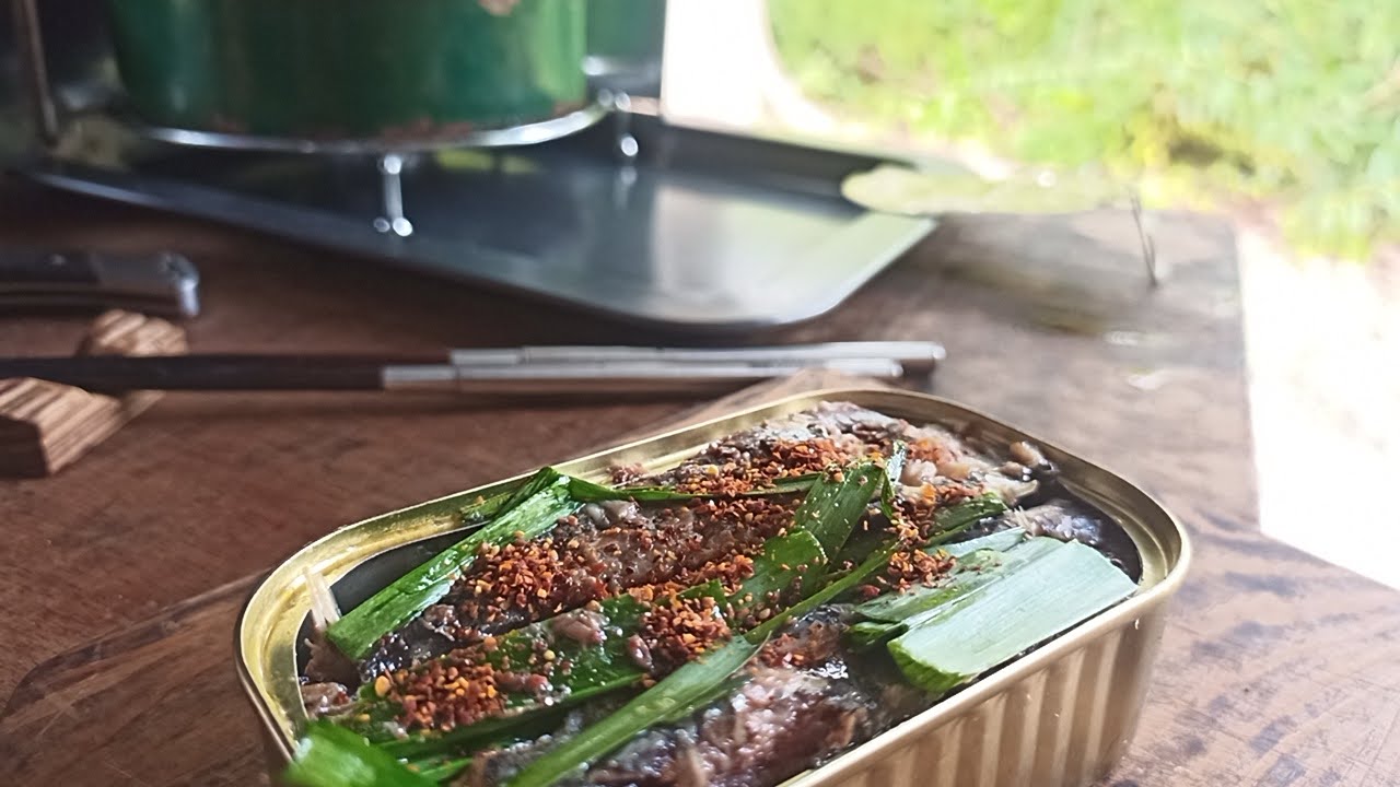 オイルサーディンにニラを乗せてコンロで温めて完成。