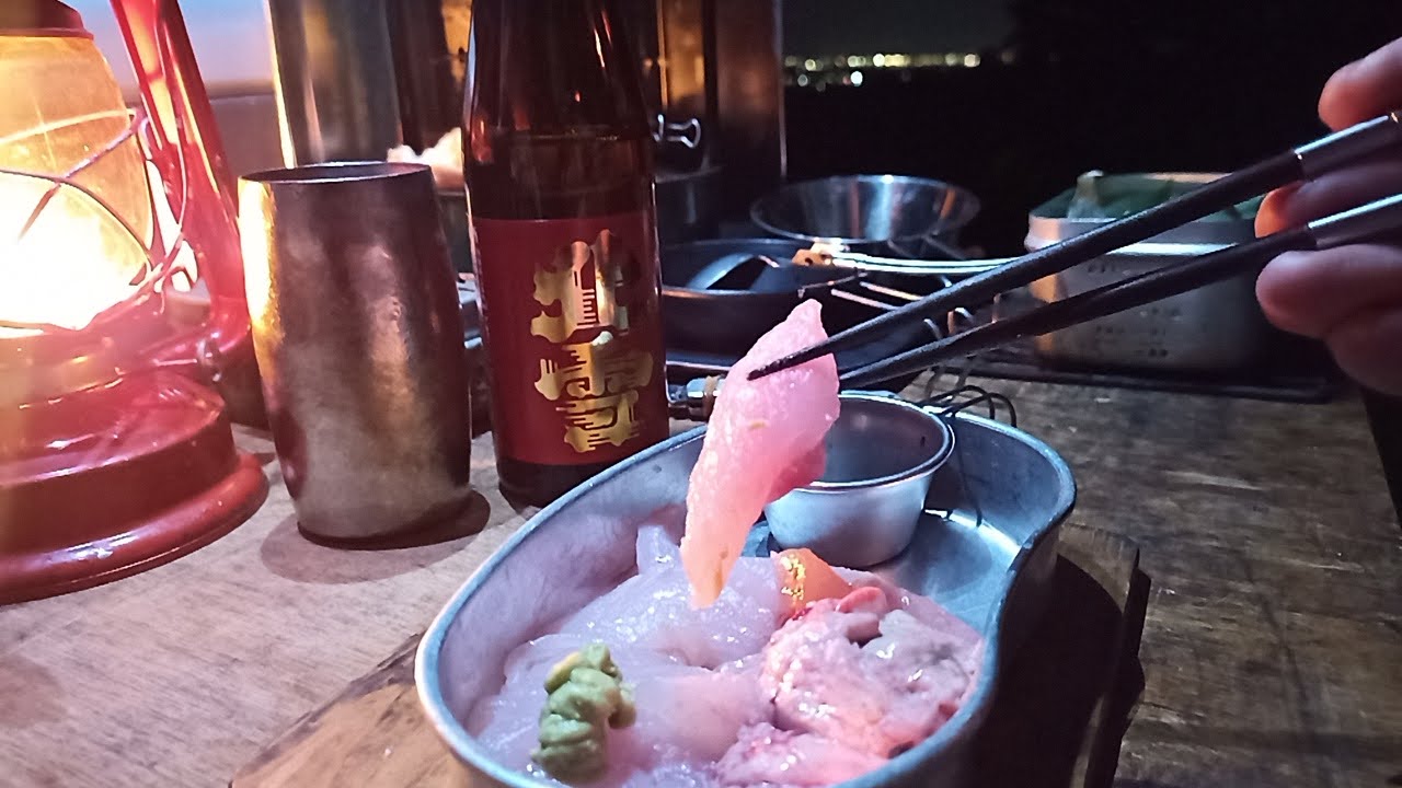 コウグリの刺身と北雪金星 キャンプ